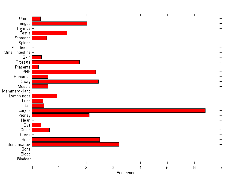The expression level is normalized with tissue-library size. Each value for a gene in a tissue is a ratio of observed ESTs to the expected one in this tissue. The expected number of ESTs is the product of total ESTs of the gene and the fraction of total ESTs in the tissue among all ESTs in 30 tissues.