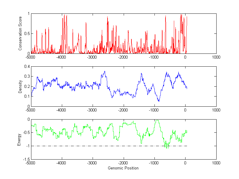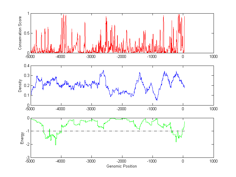 About the profiles: The conservation profile (red curve) is about conservation scores of the promoter sequences. Conservation was determined from an eight-way alignment of human, chimpanzee, dog, mouse, rat, chicken, zebrafish and fugu sequences. The conservation was quantified by a conservation score between 0 and 1, with 1 as highest conservation. The conservation score was obtained from UCSC genome databases. The density profile (blue curve) is about density of all TF binding sites. The energy profile (green curve) is about energy for module detection based on TF interaction. The positions with energy less than -1 indicate the existence of CRMs. Download: Conservation profileDensity profile Energy profile CRM summary |