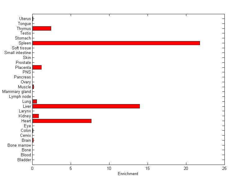 About the profile: The expression level is normalized with tissue-library size. Each value for a gene in a tissue is a ratio of observed ESTs to the expected one in this tissue. The expected number of ESTs is the product of total ESTs of the gene and the fraction of total ESTs in the tissue among all ESTs in 30 tissues. Summary: This gene is preferentially expressed in [heart, liver, spleen] Download: |