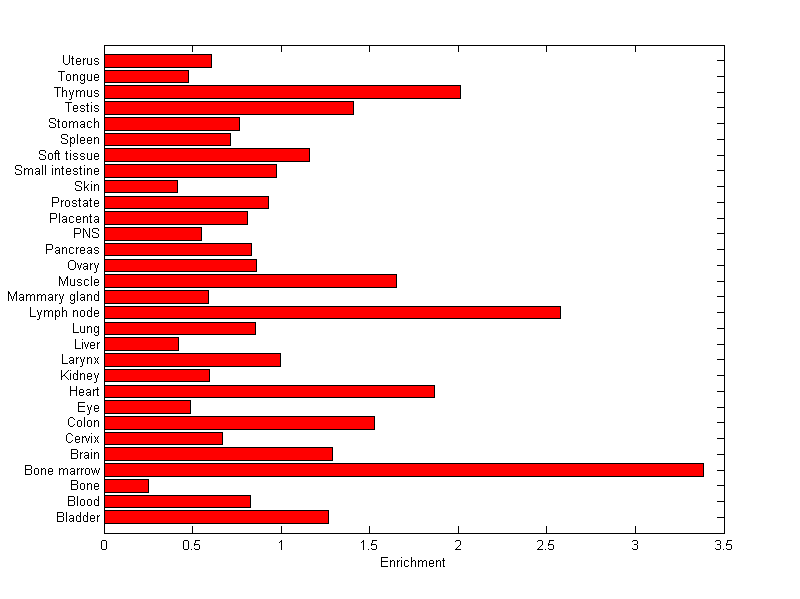 The expression level is normalized with tissue-library size. Each value for a gene in a tissue is a ratio of observed ESTs to the expected one in this tissue. The expected number of ESTs is the product of total ESTs of the gene and the fraction of total ESTs in the tissue among all ESTs in 30 tissues.