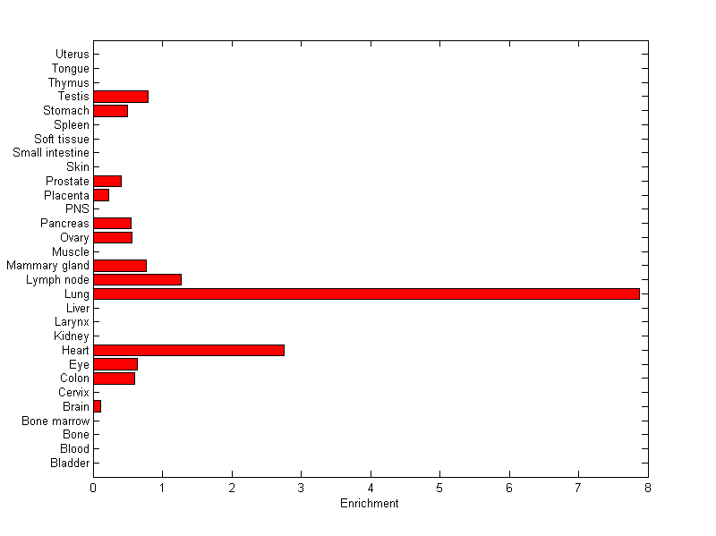 The expression level is normalized with tissue-library size. Each value for a gene in a tissue is a ratio of observed ESTs to the expected one in this tissue. The expected number of ESTs is the product of total ESTs of the gene and the fraction of total ESTs in the tissue among all ESTs in 30 tissues.