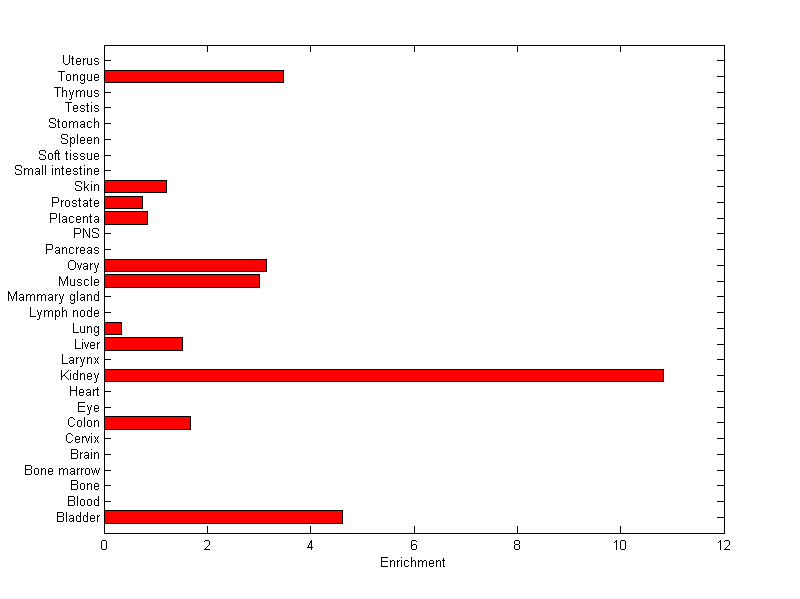 The expression level is normalized with tissue-library size. Each value for a gene in a tissue is a ratio of observed ESTs to the expected one in this tissue. The expected number of ESTs is the product of total ESTs of the gene and the fraction of total ESTs in the tissue among all ESTs in 30 tissues.