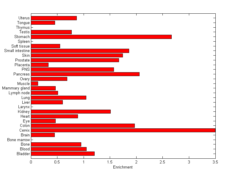 The expression level is normalized with tissue-library size. Each value for a gene in a tissue is a ratio of observed ESTs to the expected one in this tissue. The expected number of ESTs is the product of total ESTs of the gene and the fraction of total ESTs in the tissue among all ESTs in 30 tissues.