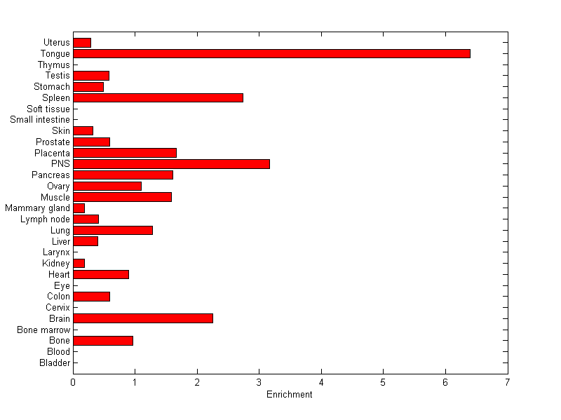 The expression level is normalized with tissue-library size. Each value for a gene in a tissue is a ratio of observed ESTs to the expected one in this tissue. The expected number of ESTs is the product of total ESTs of the gene and the fraction of total ESTs in the tissue among all ESTs in 30 tissues.