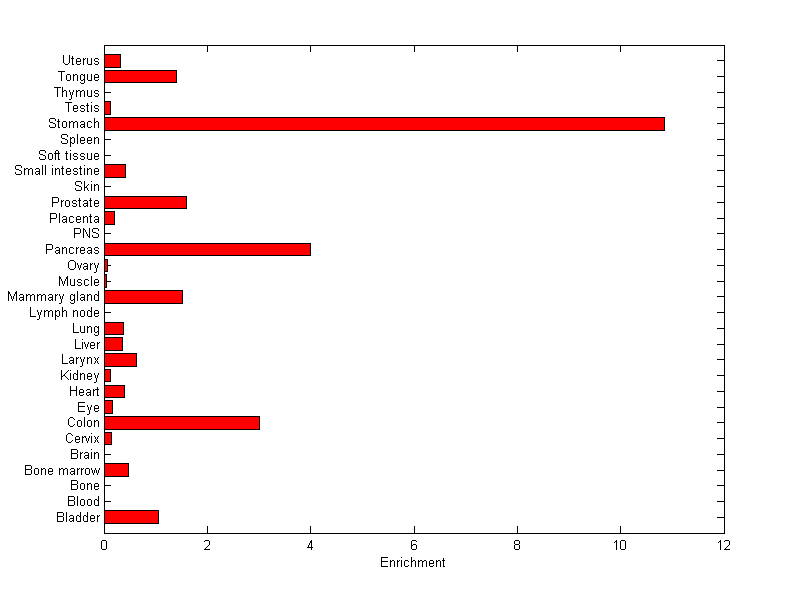 The expression level is normalized with tissue-library size. Each value for a gene in a tissue is a ratio of observed ESTs to the expected one in this tissue. The expected number of ESTs is the product of total ESTs of the gene and the fraction of total ESTs in the tissue among all ESTs in 30 tissues.
