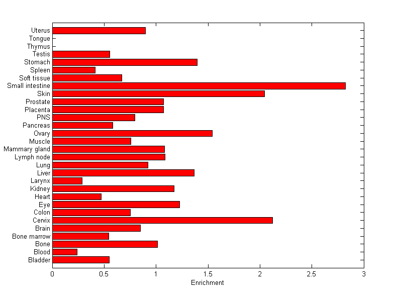 The expression level is normalized with tissue-library size. Each value for a gene in a tissue is a ratio of observed ESTs to the expected one in this tissue. The expected number of ESTs is the product of total ESTs of the gene and the fraction of total ESTs in the tissue among all ESTs in 30 tissues.