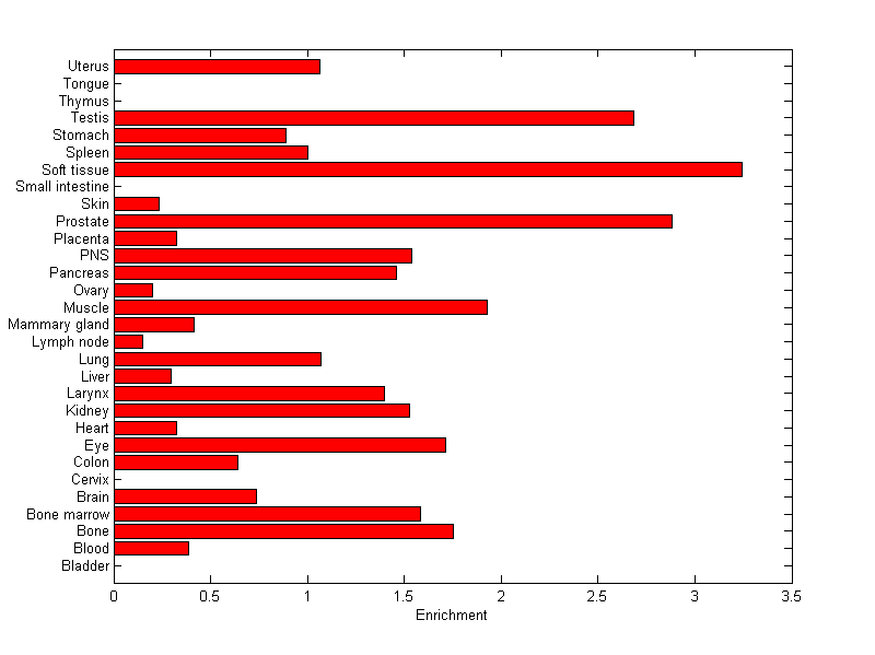 The expression level is normalized with tissue-library size. Each value for a gene in a tissue is a ratio of observed ESTs to the expected one in this tissue. The expected number of ESTs is the product of total ESTs of the gene and the fraction of total ESTs in the tissue among all ESTs in 30 tissues.