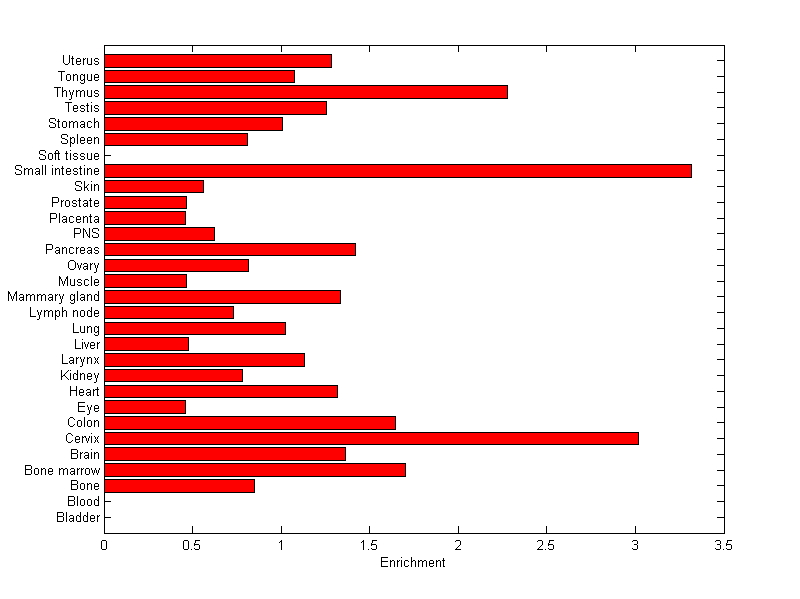 The expression level is normalized with tissue-library size. Each value for a gene in a tissue is a ratio of observed ESTs to the expected one in this tissue. The expected number of ESTs is the product of total ESTs of the gene and the fraction of total ESTs in the tissue among all ESTs in 30 tissues.