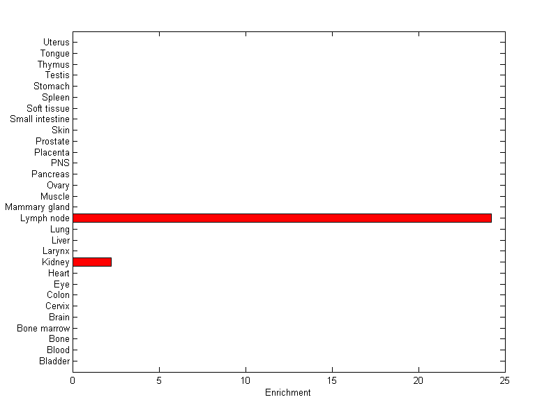 The expression level is normalized with tissue-library size. Each value for a gene in a tissue is a ratio of observed ESTs to the expected one in this tissue. The expected number of ESTs is the product of total ESTs of the gene and the fraction of total ESTs in the tissue among all ESTs in 30 tissues.