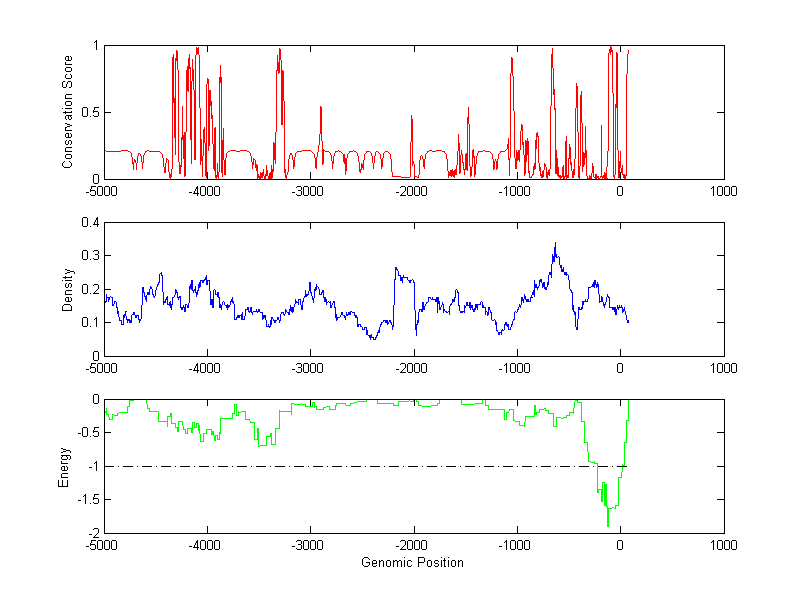 About the profiles: The conservation profile (red curve) is about conservation scores of the promoter sequences. Conservation was determined from an eight-way alignment of human, chimpanzee, dog, mouse, rat, chicken, zebrafish and fugu sequences. The conservation was quantified by a conservation score between 0 and 1, with 1 as highest conservation. The conservation score was obtained from UCSC genome databases. The density profile (blue curve) is about density of all TF binding sites. The energy profile (green curve) is about energy for module detection based on TF interaction. The positions with energy less than -1 indicate the existence of CRMs. Download: Conservation profileDensity profile Energy profile CRM summary |