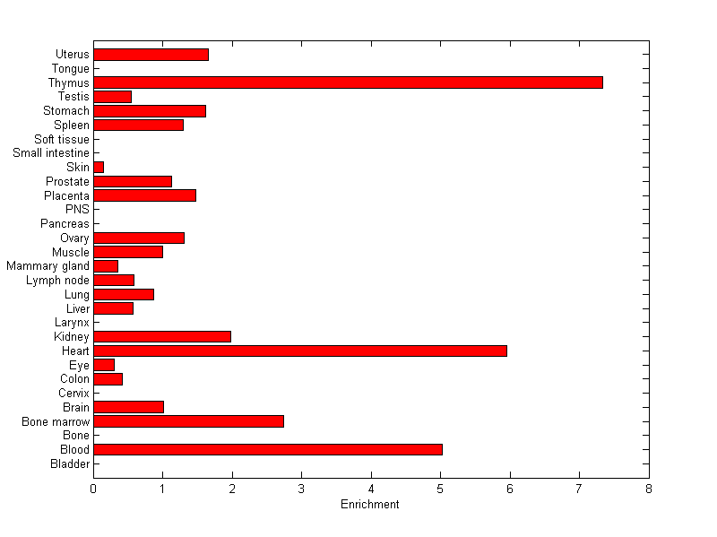 About the profile: The expression level is normalized with tissue-library size. Each value for a gene in a tissue is a ratio of observed ESTs to the expected one in this tissue. The expected number of ESTs is the product of total ESTs of the gene and the fraction of total ESTs in the tissue among all ESTs in 30 tissues. Summary: This gene is preferentially expressed in [blood, heart] Download: |