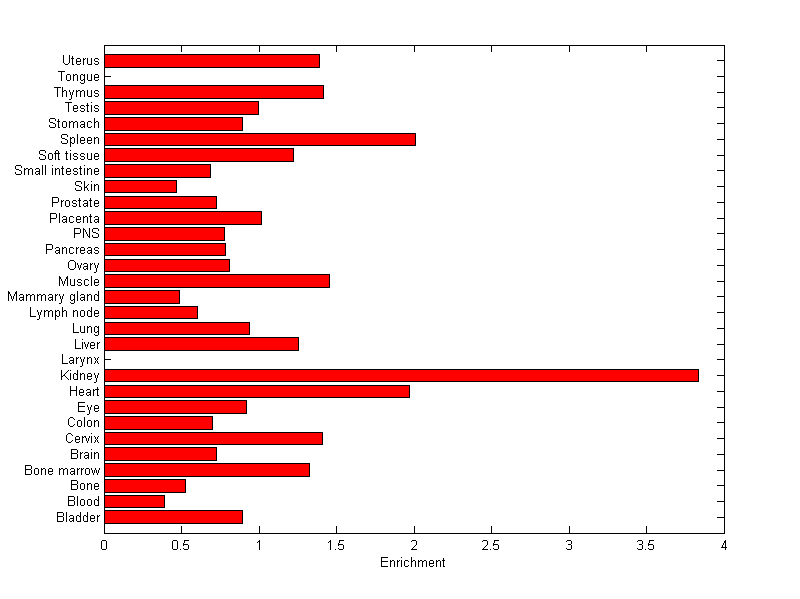 The expression level is normalized with tissue-library size. Each value for a gene in a tissue is a ratio of observed ESTs to the expected one in this tissue. The expected number of ESTs is the product of total ESTs of the gene and the fraction of total ESTs in the tissue among all ESTs in 30 tissues.