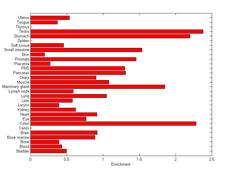 The expression level is normalized with tissue-library size. Each value for a gene in a tissue is a ratio of observed ESTs to the expected one in this tissue. The expected number of ESTs is the product of total ESTs of the gene and the fraction of total ESTs in the tissue among all ESTs in 30 tissues.