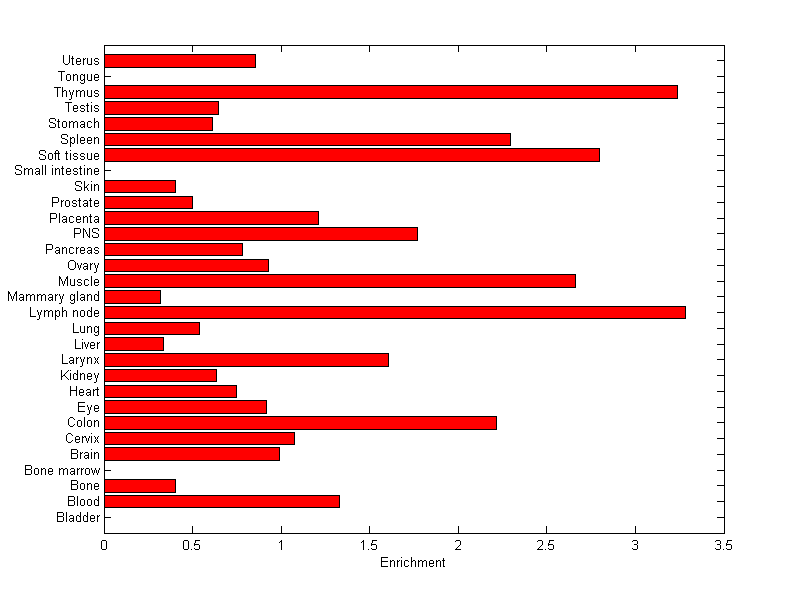 The expression level is normalized with tissue-library size. Each value for a gene in a tissue is a ratio of observed ESTs to the expected one in this tissue. The expected number of ESTs is the product of total ESTs of the gene and the fraction of total ESTs in the tissue among all ESTs in 30 tissues.