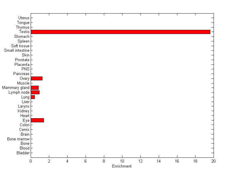 The expression level is normalized with tissue-library size. Each value for a gene in a tissue is a ratio of observed ESTs to the expected one in this tissue. The expected number of ESTs is the product of total ESTs of the gene and the fraction of total ESTs in the tissue among all ESTs in 30 tissues.