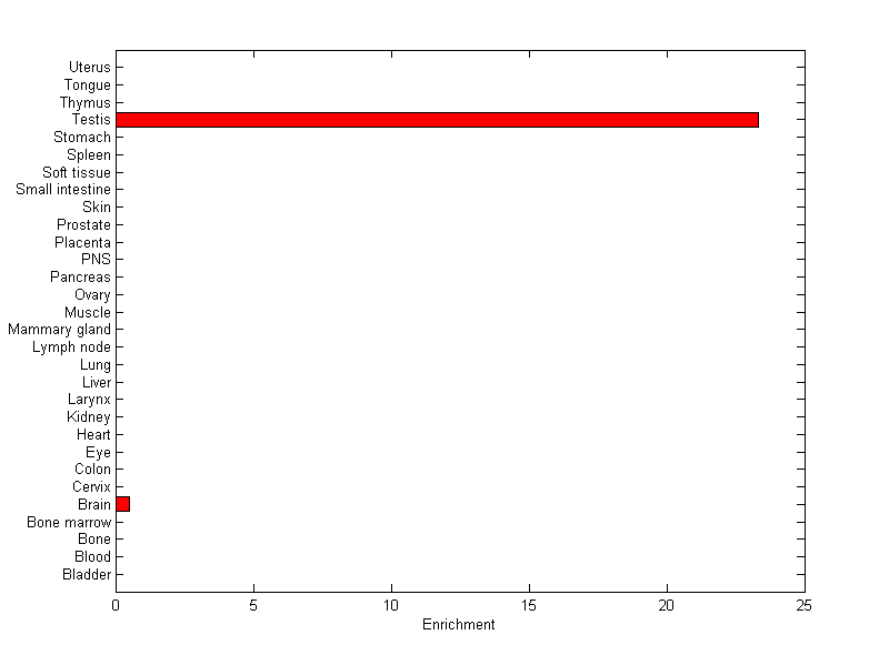 The expression level is normalized with tissue-library size. Each value for a gene in a tissue is a ratio of observed ESTs to the expected one in this tissue. The expected number of ESTs is the product of total ESTs of the gene and the fraction of total ESTs in the tissue among all ESTs in 30 tissues.