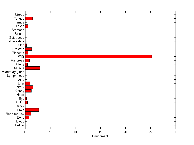The expression level is normalized with tissue-library size. Each value for a gene in a tissue is a ratio of observed ESTs to the expected one in this tissue. The expected number of ESTs is the product of total ESTs of the gene and the fraction of total ESTs in the tissue among all ESTs in 30 tissues.
