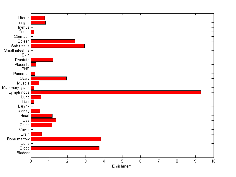 The expression level is normalized with tissue-library size. Each value for a gene in a tissue is a ratio of observed ESTs to the expected one in this tissue. The expected number of ESTs is the product of total ESTs of the gene and the fraction of total ESTs in the tissue among all ESTs in 30 tissues.