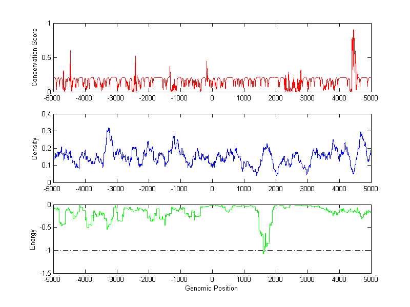 About the profiles: The conservation profile (red curve) is about conservation scores of the promoter sequences. Conservation was determined from an eight-way alignment of human, chimpanzee, dog, mouse, rat, chicken, zebrafish and fugu sequences. The conservation was quantified by a conservation score between 0 and 1, with 1 as highest conservation. The conservation score was obtained from UCSC genome databases. The density profile (blue curve) is about density of all TF binding sites. The energy profile (green curve) is about energy for module detection based on TF interaction. The positions with energy less than -1 indicate the existence of CRMs. Download: Conservation profileDensity profile Energy profile CRM summary |