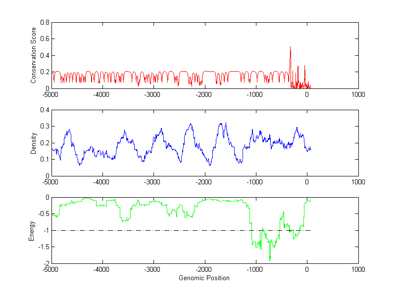 About the profiles: The conservation profile (red curve) is about conservation scores of the promoter sequences. Conservation was determined from an eight-way alignment of human, chimpanzee, dog, mouse, rat, chicken, zebrafish and fugu sequences. The conservation was quantified by a conservation score between 0 and 1, with 1 as highest conservation. The conservation score was obtained from UCSC genome databases. The density profile (blue curve) is about density of all TF binding sites. The energy profile (green curve) is about energy for module detection based on TF interaction. The positions with energy less than -1 indicate the existence of CRMs. Download: Conservation profileDensity profile Energy profile CRM summary |