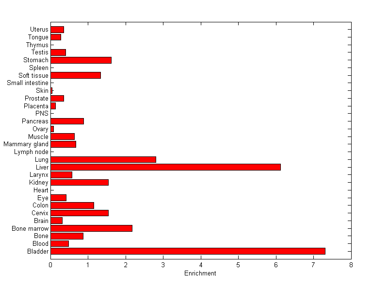 About the profile: The expression level is normalized with tissue-library size. Each value for a gene in a tissue is a ratio of observed ESTs to the expected one in this tissue. The expected number of ESTs is the product of total ESTs of the gene and the fraction of total ESTs in the tissue among all ESTs in 30 tissues. Summary: This gene is preferentially expressed in [bladder, liver] Download: |