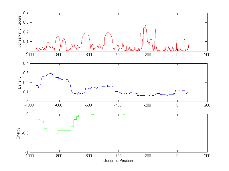About the profiles: The conservation profile (red curve) is about conservation scores of the promoter sequences. Conservation was determined from an eight-way alignment of human, chimpanzee, dog, mouse, rat, chicken, zebrafish and fugu sequences. The conservation was quantified by a conservation score between 0 and 1, with 1 as highest conservation. The conservation score was obtained from UCSC genome databases. The density profile (blue curve) is about density of all TF binding sites. The energy profile (green curve) is about energy for module detection based on TF interaction. The positions with energy less than -1 indicate the existence of CRMs. Download: Conservation profileDensity profile Energy profile CRM summary |