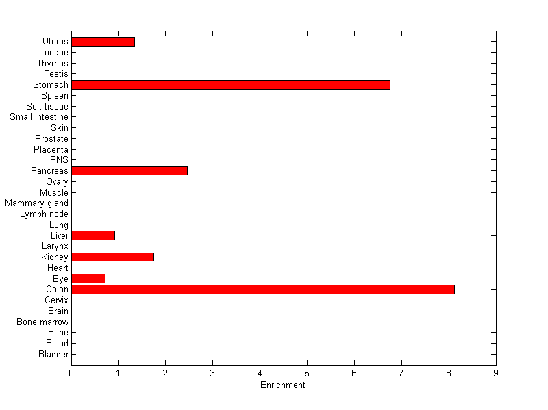 About the profile: The expression level is normalized with tissue-library size. Each value for a gene in a tissue is a ratio of observed ESTs to the expected one in this tissue. The expected number of ESTs is the product of total ESTs of the gene and the fraction of total ESTs in the tissue among all ESTs in 30 tissues. Summary: This gene is preferentially expressed in [colon, stomach] Download: |