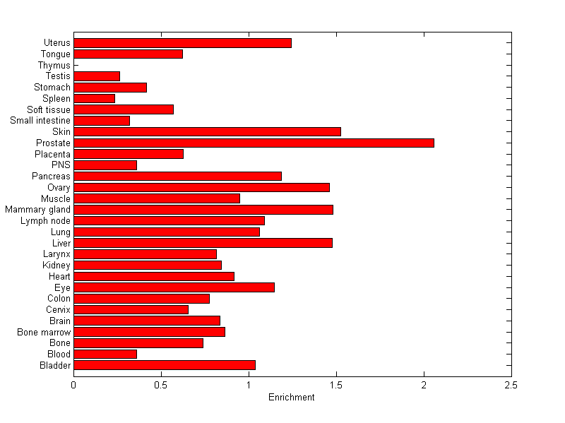 The expression level is normalized with tissue-library size. Each value for a gene in a tissue is a ratio of observed ESTs to the expected one in this tissue. The expected number of ESTs is the product of total ESTs of the gene and the fraction of total ESTs in the tissue among all ESTs in 30 tissues.