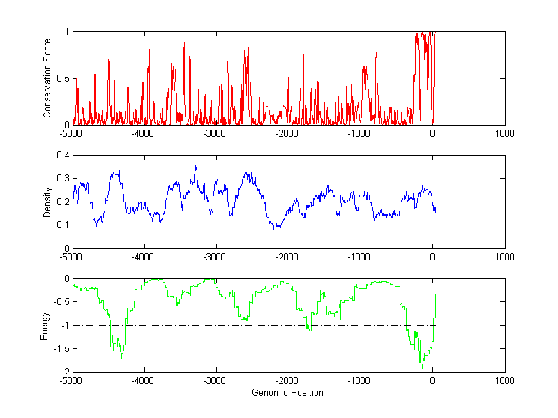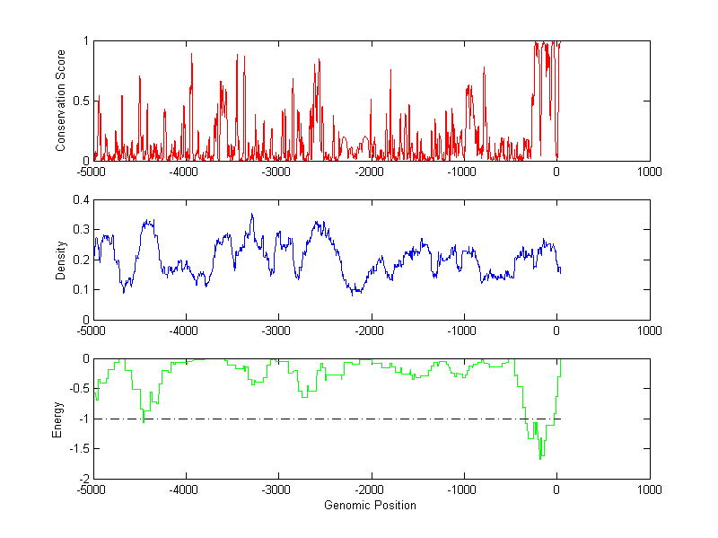 About the profiles: The conservation profile (red curve) is about conservation scores of the promoter sequences. Conservation was determined from an eight-way alignment of human, chimpanzee, dog, mouse, rat, chicken, zebrafish and fugu sequences. The conservation was quantified by a conservation score between 0 and 1, with 1 as highest conservation. The conservation score was obtained from UCSC genome databases. The density profile (blue curve) is about density of all TF binding sites. The energy profile (green curve) is about energy for module detection based on TF interaction. The positions with energy less than -1 indicate the existence of CRMs. Download: Conservation profileDensity profile Energy profile CRM summary |