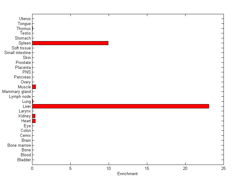 About the profile: The expression level is normalized with tissue-library size. Each value for a gene in a tissue is a ratio of observed ESTs to the expected one in this tissue. The expected number of ESTs is the product of total ESTs of the gene and the fraction of total ESTs in the tissue among all ESTs in 30 tissues. Summary: This gene is preferentially expressed in [liver, spleen] Download: |