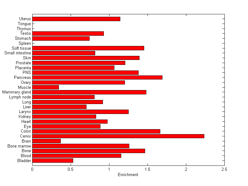The expression level is normalized with tissue-library size. Each value for a gene in a tissue is a ratio of observed ESTs to the expected one in this tissue. The expected number of ESTs is the product of total ESTs of the gene and the fraction of total ESTs in the tissue among all ESTs in 30 tissues.