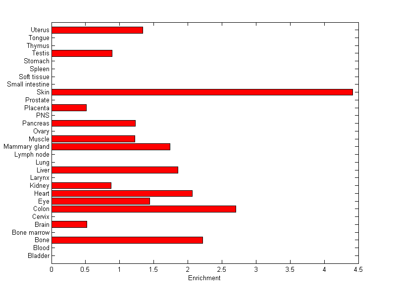 The expression level is normalized with tissue-library size. Each value for a gene in a tissue is a ratio of observed ESTs to the expected one in this tissue. The expected number of ESTs is the product of total ESTs of the gene and the fraction of total ESTs in the tissue among all ESTs in 30 tissues.