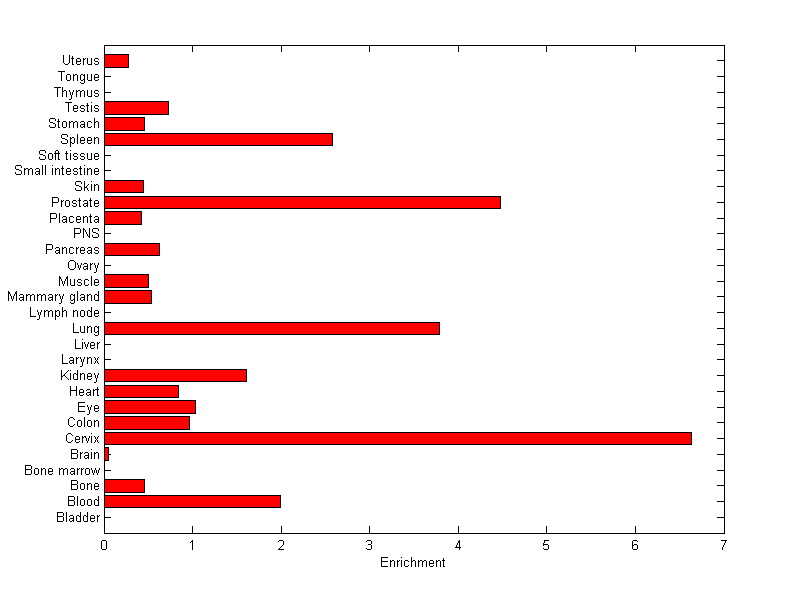 The expression level is normalized with tissue-library size. Each value for a gene in a tissue is a ratio of observed ESTs to the expected one in this tissue. The expected number of ESTs is the product of total ESTs of the gene and the fraction of total ESTs in the tissue among all ESTs in 30 tissues.