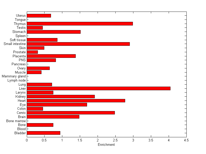 The expression level is normalized with tissue-library size. Each value for a gene in a tissue is a ratio of observed ESTs to the expected one in this tissue. The expected number of ESTs is the product of total ESTs of the gene and the fraction of total ESTs in the tissue among all ESTs in 30 tissues.