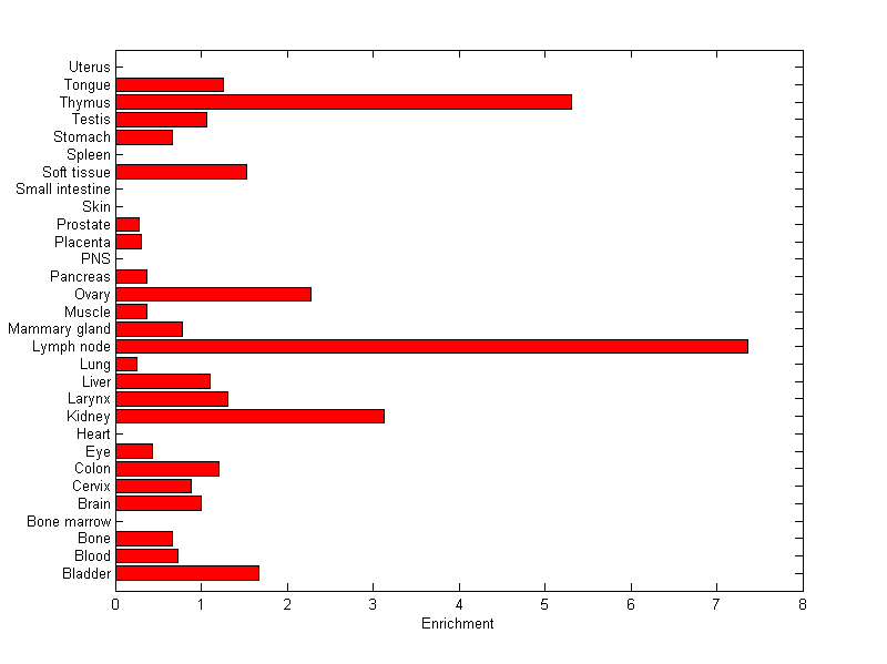 The expression level is normalized with tissue-library size. Each value for a gene in a tissue is a ratio of observed ESTs to the expected one in this tissue. The expected number of ESTs is the product of total ESTs of the gene and the fraction of total ESTs in the tissue among all ESTs in 30 tissues.
