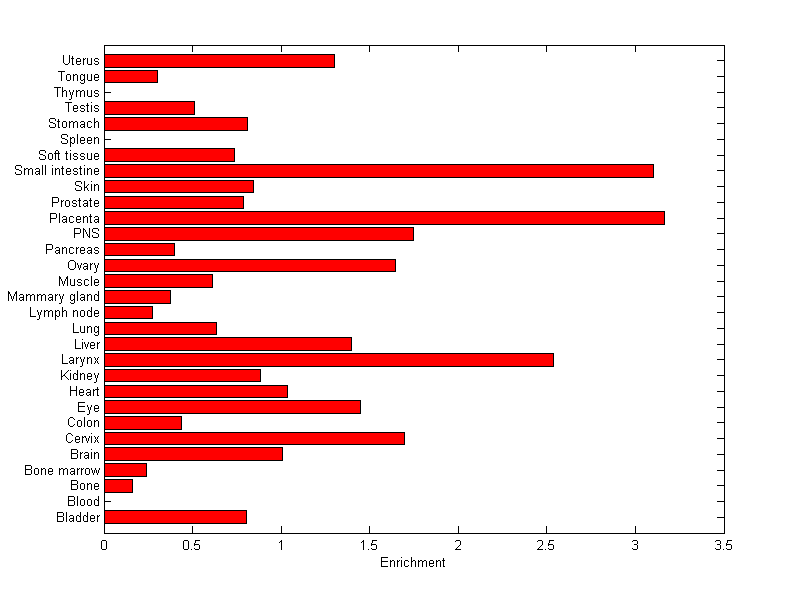 The expression level is normalized with tissue-library size. Each value for a gene in a tissue is a ratio of observed ESTs to the expected one in this tissue. The expected number of ESTs is the product of total ESTs of the gene and the fraction of total ESTs in the tissue among all ESTs in 30 tissues.