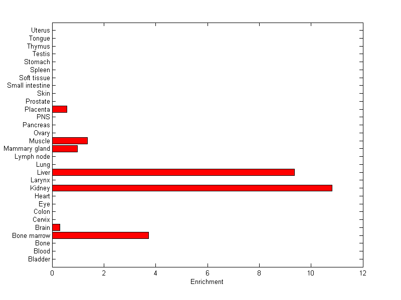 The expression level is normalized with tissue-library size. Each value for a gene in a tissue is a ratio of observed ESTs to the expected one in this tissue. The expected number of ESTs is the product of total ESTs of the gene and the fraction of total ESTs in the tissue among all ESTs in 30 tissues.