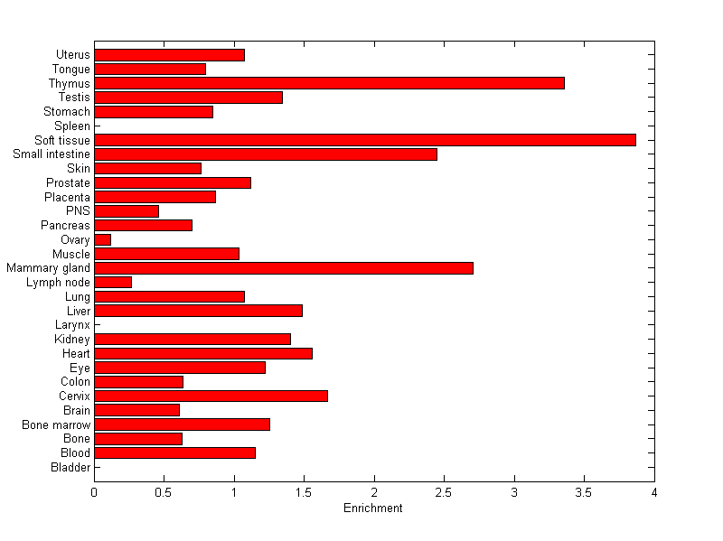 The expression level is normalized with tissue-library size. Each value for a gene in a tissue is a ratio of observed ESTs to the expected one in this tissue. The expected number of ESTs is the product of total ESTs of the gene and the fraction of total ESTs in the tissue among all ESTs in 30 tissues.