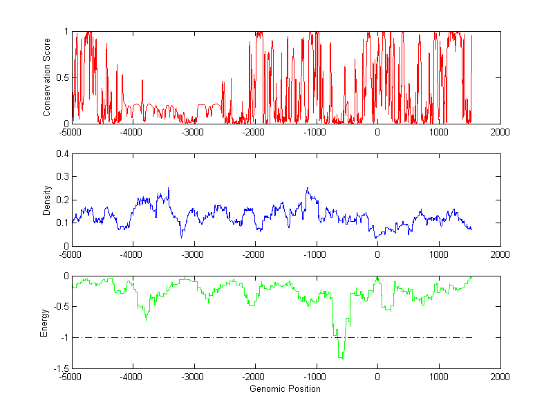 The energy profile (green curve) is about energy for module detection based on TF interaction. The positions with energy less than -1 indicate the existence of CRMs.