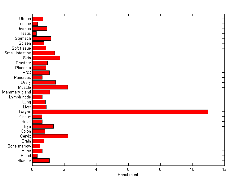 The expression level is normalized with tissue-library size. Each value for a gene in a tissue is a ratio of observed ESTs to the expected one in this tissue. The expected number of ESTs is the product of total ESTs of the gene and the fraction of total ESTs in the tissue among all ESTs in 30 tissues.