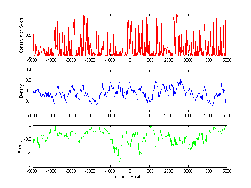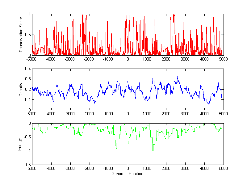 About the profiles: The conservation profile (red curve) is about conservation scores of the promoter sequences. Conservation was determined from an eight-way alignment of human, chimpanzee, dog, mouse, rat, chicken, zebrafish and fugu sequences. The conservation was quantified by a conservation score between 0 and 1, with 1 as highest conservation. The conservation score was obtained from UCSC genome databases. The density profile (blue curve) is about density of all TF binding sites. The energy profile (green curve) is about energy for module detection based on TF interaction. The positions with energy less than -1 indicate the existence of CRMs. Download: Conservation profileDensity profile Energy profile CRM summary |