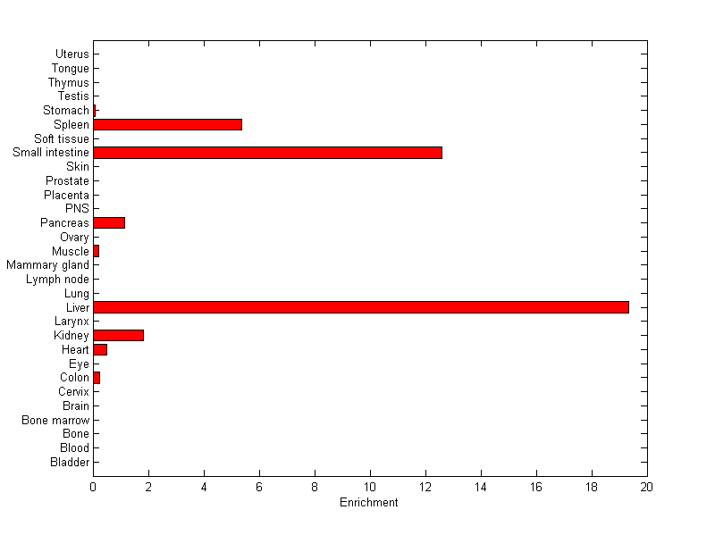 About the profile: The expression level is normalized with tissue-library size. Each value for a gene in a tissue is a ratio of observed ESTs to the expected one in this tissue. The expected number of ESTs is the product of total ESTs of the gene and the fraction of total ESTs in the tissue among all ESTs in 30 tissues. Summary: This gene is preferentially expressed in [liver, small_intestine, spleen] Download: |