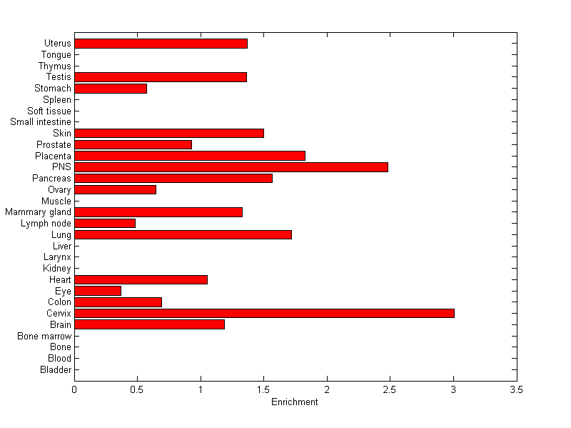 The expression level is normalized with tissue-library size. Each value for a gene in a tissue is a ratio of observed ESTs to the expected one in this tissue. The expected number of ESTs is the product of total ESTs of the gene and the fraction of total ESTs in the tissue among all ESTs in 30 tissues.