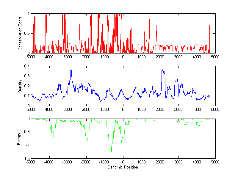 The energy profile (green curve) is about energy for module detection based on TF interaction. The positions with energy less than -1 indicate the existence of CRMs.
