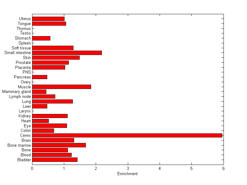 The expression level is normalized with tissue-library size. Each value for a gene in a tissue is a ratio of observed ESTs to the expected one in this tissue. The expected number of ESTs is the product of total ESTs of the gene and the fraction of total ESTs in the tissue among all ESTs in 30 tissues.