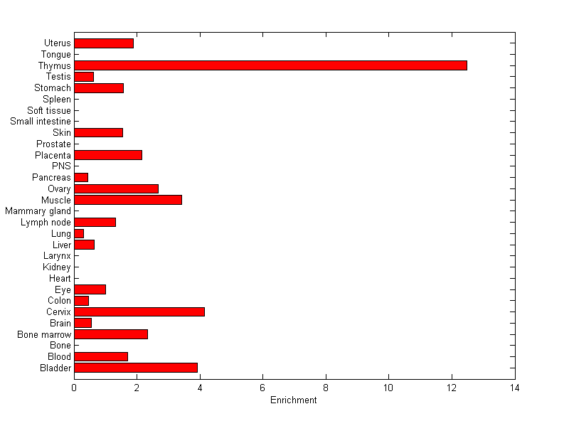 The expression level is normalized with tissue-library size. Each value for a gene in a tissue is a ratio of observed ESTs to the expected one in this tissue. The expected number of ESTs is the product of total ESTs of the gene and the fraction of total ESTs in the tissue among all ESTs in 30 tissues.