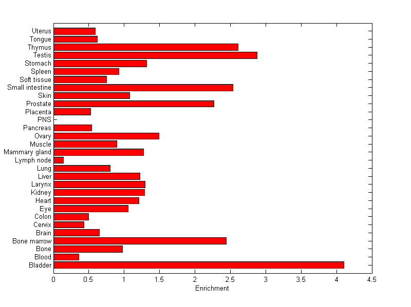 The expression level is normalized with tissue-library size. Each value for a gene in a tissue is a ratio of observed ESTs to the expected one in this tissue. The expected number of ESTs is the product of total ESTs of the gene and the fraction of total ESTs in the tissue among all ESTs in 30 tissues.
