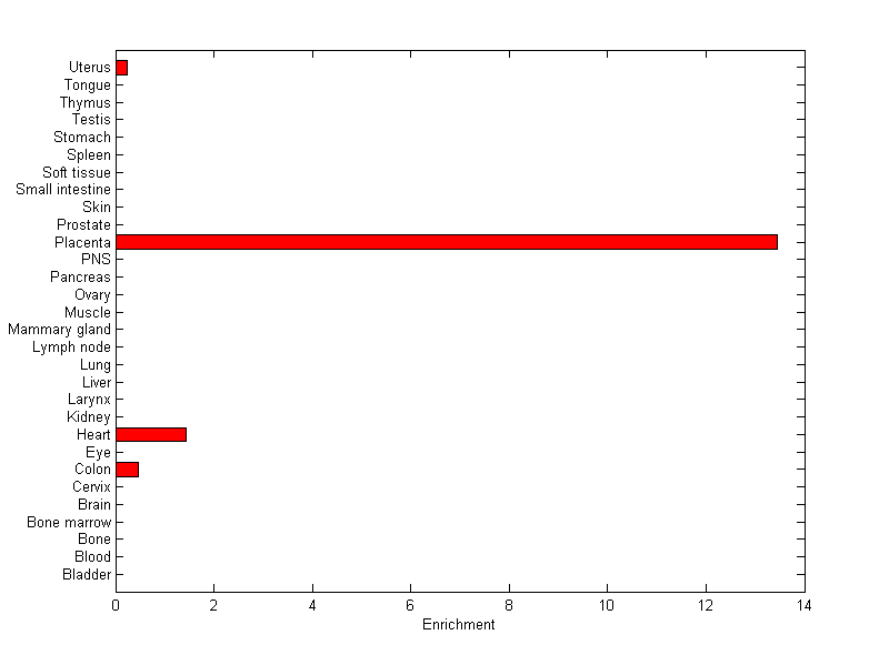 The expression level is normalized with tissue-library size. Each value for a gene in a tissue is a ratio of observed ESTs to the expected one in this tissue. The expected number of ESTs is the product of total ESTs of the gene and the fraction of total ESTs in the tissue among all ESTs in 30 tissues.