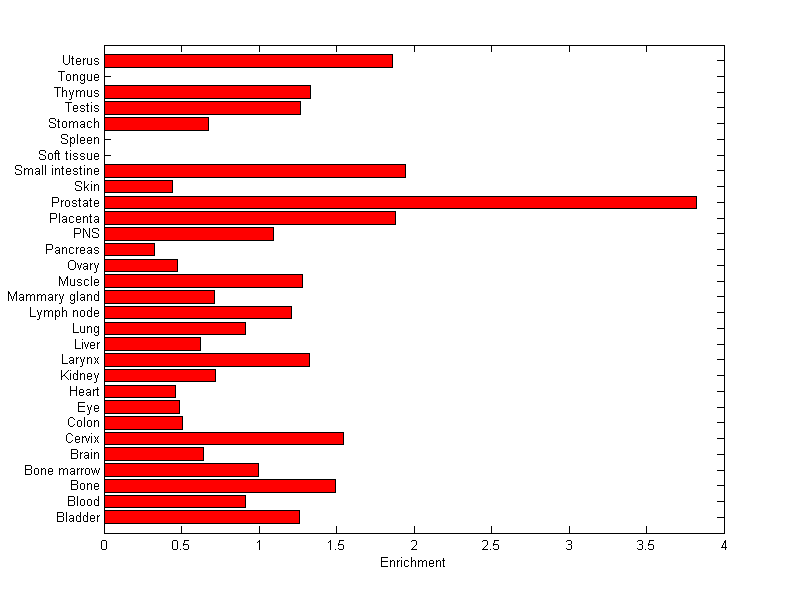 The expression level is normalized with tissue-library size. Each value for a gene in a tissue is a ratio of observed ESTs to the expected one in this tissue. The expected number of ESTs is the product of total ESTs of the gene and the fraction of total ESTs in the tissue among all ESTs in 30 tissues.