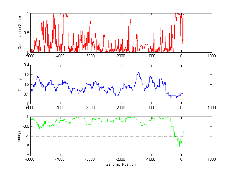 The energy profile (green curve) is about energy for module detection based on TF interaction. The positions with energy less than -1 indicate the existence of CRMs.